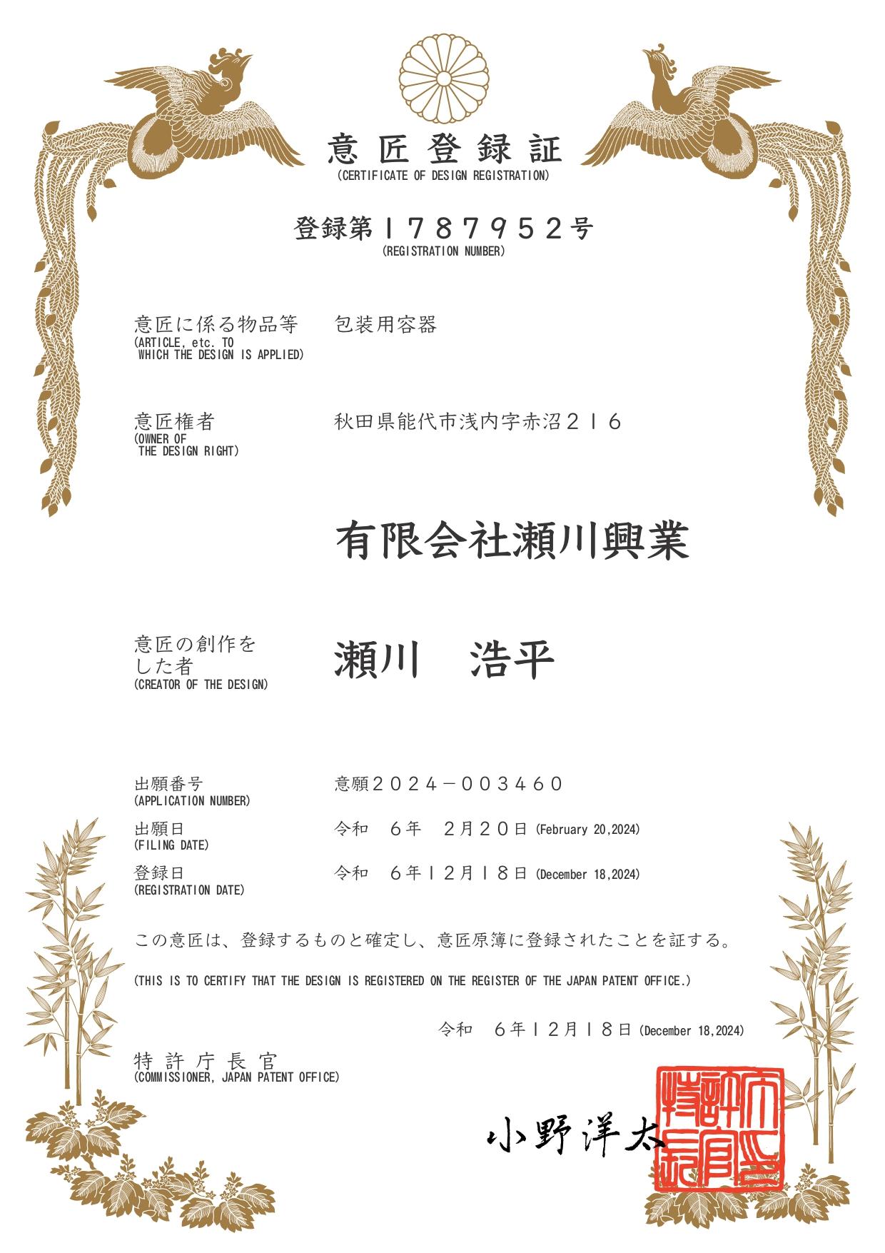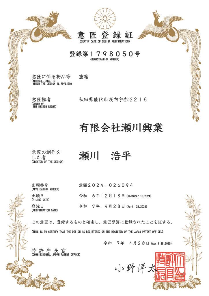 弊社は「宵波」を使用した箱型の意匠権を持っております